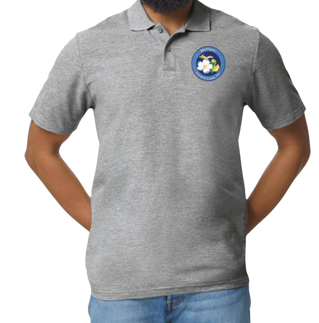 A soft woven cotton shirt in Sport Grey featuring the MGC Logo on the left side and Optional Club Name Printed underneath the logo if desired.